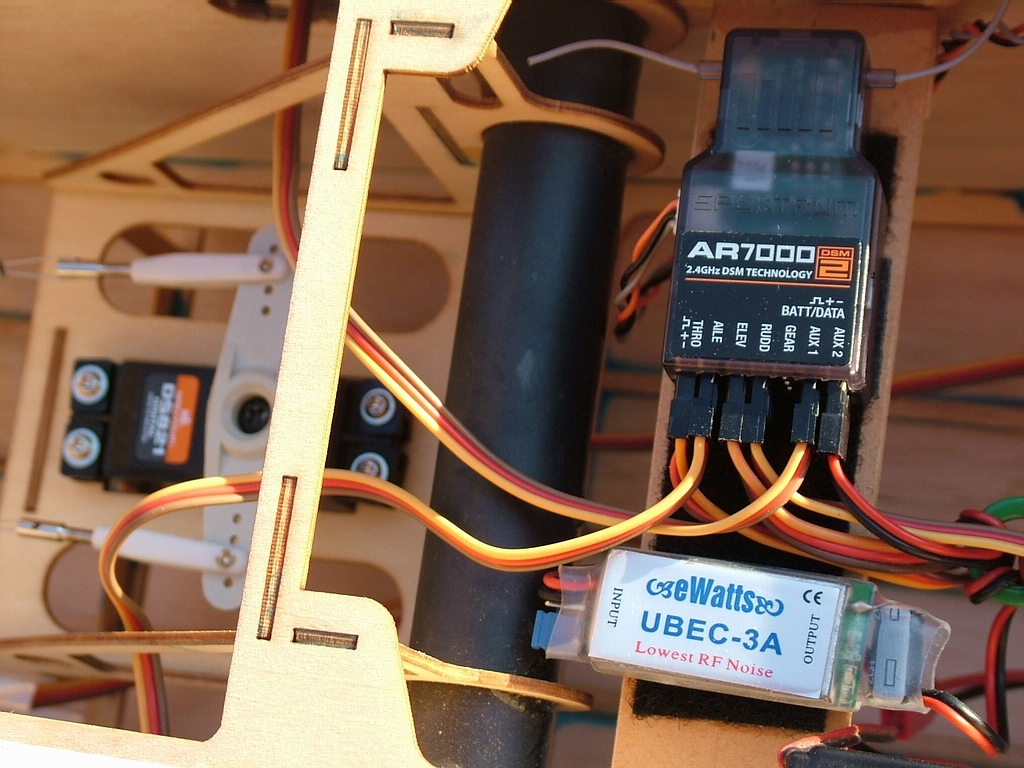 - Spektrum DX7S radio. - Spektrum AR7000 (incl satelite rx) receiver. - Spektrum DS821 servos for ailerons and rudder. Very nice quality! - 2 x Hitec HS-225BB analog servos for the elevator. One servo was internally reversed so they could be Y joined and run off a single channel. |