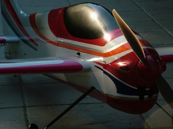 - Electric Powered using: - 16x8 APC 2 blade prop. - OS Motor OMA-5025-375kv outrunner - Enough power for good aerobatics. - 120A YEP Opto Speed Controller. - 5S in series with 3S (4500 to 5000) 40c+ LiPo battery set. 2000 Watts available. - Both an arming switch and spark arrestor system are employed here. - No extra weight added to achieve COG. Battery adjustment used for fine tuning. - Running a separate 2S 1000mah Lipo through a switch and UBEC to the receiver. |