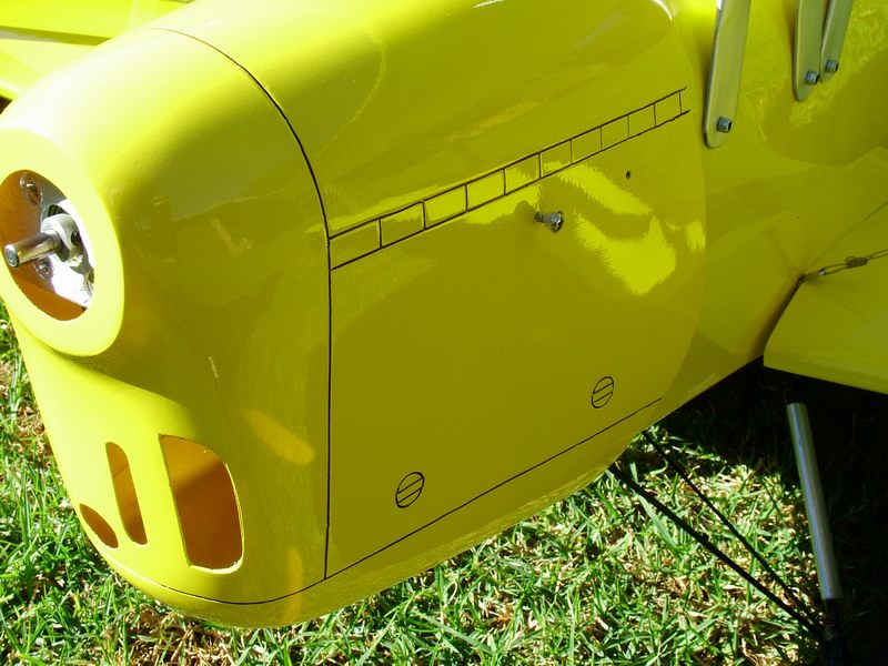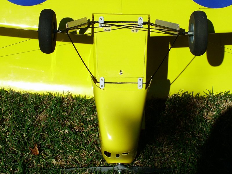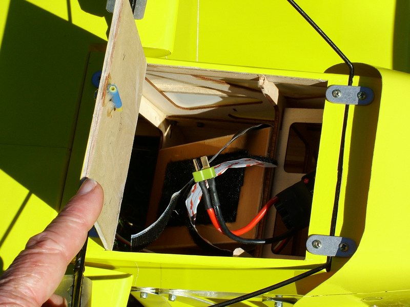 Custom hatch added between landing gear supports. Battery is suspended from